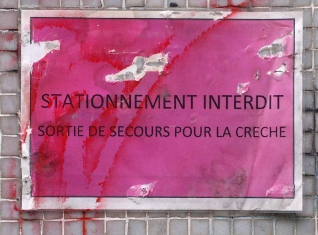 Sur la porte de la crèche une affiche prétentieuse car les véhicules de la fourrière ne sont pas en capacité physique et juridique d'enlever les véhicules qui stationnent en semaine sur cet endroit.